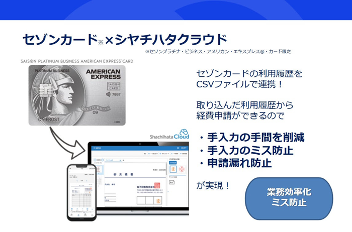 具体的に、セゾンカード会員サイトからダウンロードした利用明細のCSVファイルをShachihata Cloud経費精算にアップロードする。その取り込んだデータを参照して経費申請書を作成できるため、利用者は手入力の工数を大幅に削減して経費申請を完了させることが可能だ。また、経理処理も仕分け作業などは必要なく、経理処理を完了することができるのが特長だとしている。