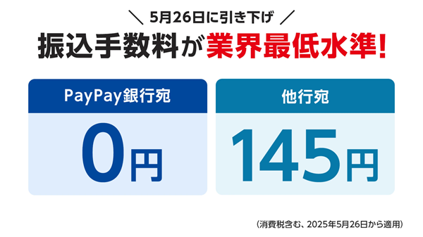 PayPay銀行は、2025年5月26日より法人および個人事業主口座のインターネットバンキングでの振込手数料を改定し、大幅に引き下げる。これにより、業界最低水準での振り込みが可能になるという(同社調べ)。5月26日改定後はPayPay銀行口座宛が55円から0円、他の金融機関宛が160円から145円となるそうだ(消費税含む)。