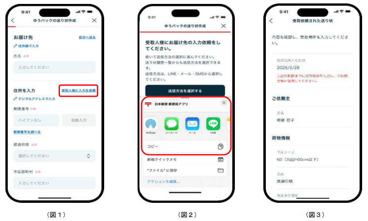 「受取人様に入力を依頼」から利用できる(図1)、荷物の情報等を入力後、LINE・メール・SMS で郵便局アプリが発行した URL を共有すると(図2)、