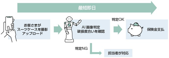 また、利用者が撮影した破損したスーツケースの画像をAIが読み取り、破損の有無と状態を自動判定することが可能となった。同サービスの導入により、スーツケース破損の画像査定を自動化することで、担当者による損害確認や支払手続きなどの作業が不要となることによって、これまで最短3日かかっていた保険金支払を最短即日で行うことが可能だという。