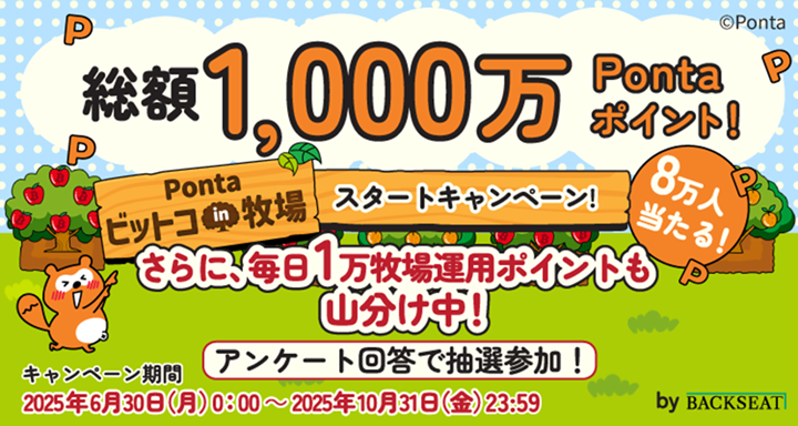 BACKSEAT暗号資産交換業(以下、BACKSEAT)とロイヤリティ マーケティング(LM)は、2025年6月30日、Pontaポイントを活用した暗号資産(仮想通貨)運用体験サービス「Pontaビットコin牧場」の提供を開始した。また、同サービスの開始を記念し、総額1,000万円相当のPontaポイントをプレゼントするキャンペーンを実施する。