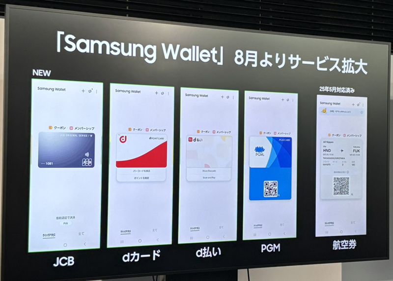 サムソン電子ジャパンは、2025 年8月以降、モバイルウォレット「Samsung Wallet」にジェーシービー(JCB)が発行するカード、NTTドコモの「dポイント」、「d払い」、パシフィックゴルフマネジメントのゴルフ場予約アプリ「PGM」が追加されると発表した。