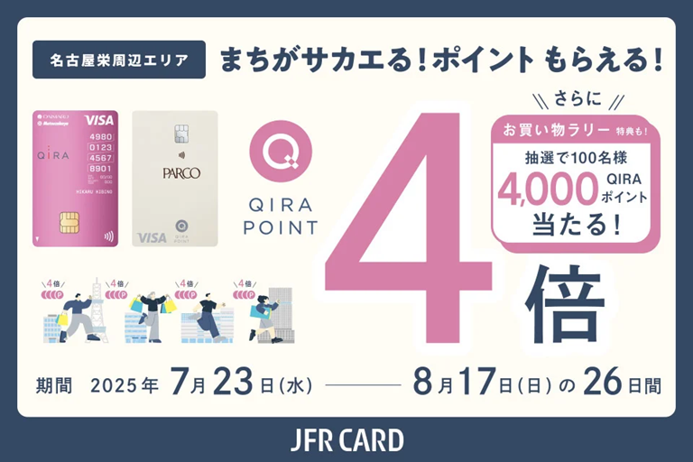 JFRカードは、2025年7月23日~8月17日の期間、名古屋・栄周辺エリアの対象店舗にて、JFRカードが発行するクレジットカードの利用でQIRA[キラ]ポイントが4倍貯まる「QIRAポイントキャンペーン」を実施する。さらに、「松坂屋名古屋店」と「4倍対象店舗」を組み合わせて利用することで、抽選で100名に4,000ポイントが当たる「お買い物ラリー」も同時開催する。