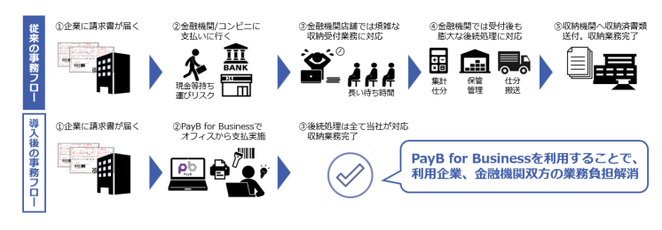 また、金融機関の窓口には年間 2 億件を超える税金等の納付書が持ち込まれており、そのうち6割以上を占める法人による持ち込みにかかる収納業務の負担は、金融機関にとっても大きな課題となっており、PayB 提携金融機関からもこの窓口収納業務の負荷軽減のためのソリューションとして「PayB」の法人向け展開をかねてより要望としてもらっていた。