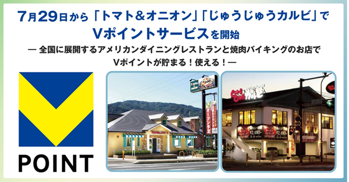 トマトアンドアソシエイツとCCCMKホールディングス(CCCMKHD)、三井住友カードは、トマトアンドアソシエイツが運営する「トマト&オニオン」と「じゅうじゅうカルビ」にて2025年7月29日より、Vポイントが貯まって使えるサービスを開始すると発表した。