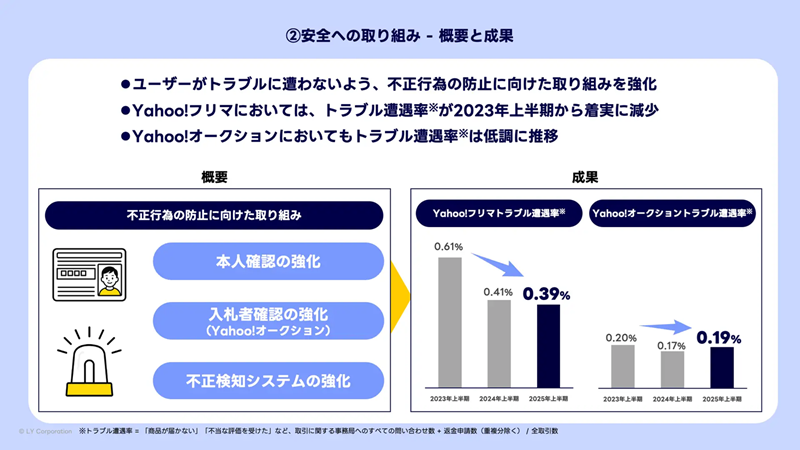 LINEヤフーが提供するフリマアプリ「Yahoo!フリマ」と、日本最大級のネットオークションサービス「Yahoo!オークション」は、これまでの不正行為の防止への取り組みや実績などをまとめた「安全・安心への取り組みレポート」を初めて公開し、今後も定期的に公開する予定だという。