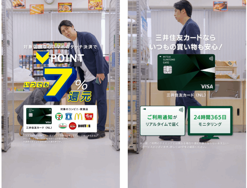 「最近あいつの様子がおかしい」篇では、三井住友カードのスマホのタッチ決済で、対象店舗で7%のポイント還元が受けられることを紹介。三井住友カードでポイントを賢く貯める屋敷さんと、その事実を知らずに悔やむ嶋佐さんの対比が描かれているそうだ。
