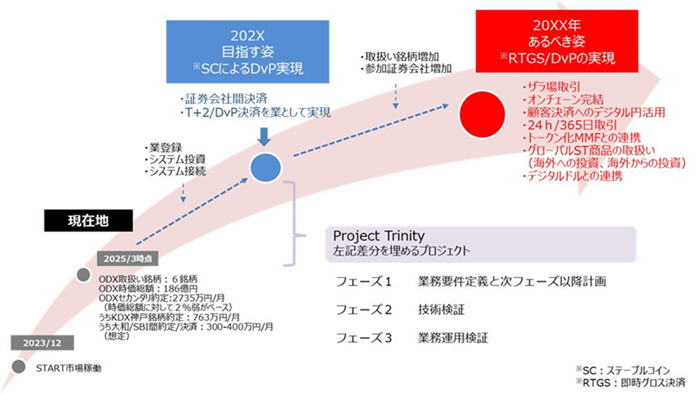 なお、同プロジェクトにおいては、より近い未来で実現されるであろう「証券会社間におけるステーブルコインを活用したT+2のDvP決済」を目指す姿として定義し、現状からの差分を埋めることを目的として取り組みを開始している。