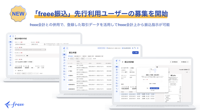 フリー(freee)は、freee会計内で振込指示を完結できるサービス「freee振込」の先行利用ユーザーの募集を開始した。freee振込とfreee会計を併用することで、登録した取引データを活用してfreee会計上から振込指示が可能だ。また、全てのfreee会計ユーザーへの提供開始は2026年春頃を予定している。
