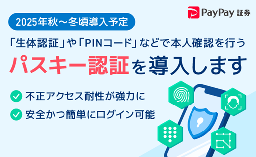 PayPay証券は、各種アプリおよびPC取引サイトにおいて2025年秋〜冬頃より「パスキー認証(FIDO2認証、Passkeys)」を導入すると発表した。「パスキー認証」は従来のパスワード認証と比べ、不正アクセスやフィッシング詐欺に対する耐性が向上した認証技術だという。