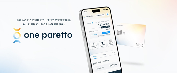 「one paretto」は、非対面・非接触での決済体験を追求したデジタルカードサービスだという。スマートフォンアプリからの申し込みで即時にバーチャルカードが発行され、Apple PayやGoogle Payを通じたタッチ決済にも対応しており、アプリ内での利用明細確認・各種設定も可能だという。