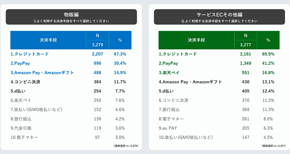 ●物販:「クレジットカード」67.3%、「PayPay」30.4%、「Amazon Pay/Amazonギフト」14.9%、「コンビニ決済」11.7%ほか。