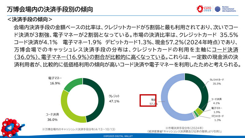 日本市場における2024年の決済状況は、現金の比率が57.2%を占め、クレジットカード35.5%、コード決済4.1%、電子マネー1.9%などとなっており、現金以外では、クレジットカードが大半を占めています。一方で現金が使えない万博会場においては、クレジットカードの比率は47.1%にとどまり、逆にコード決済が36.0%と、日本市場全体の状況と比べるとかなり大きな比率を占めています。少額決済を中心にコード決済が活発に使われたという傾向の表れだと思います。
