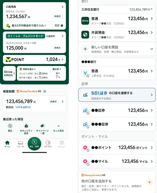 「三井住友銀行アプリ」では、ユーザーの三井住友銀行の口座状況に加えて、「マネーフォワード ME」に連携している銀行・証券口座等の状況を確認できるようになる。そのため、複数の口座状況を確認するために複数のアプリを行き来する手間を省き、1つの画面で「どこの口座に、いくらあるか」をスムーズに把握することが可能だという。