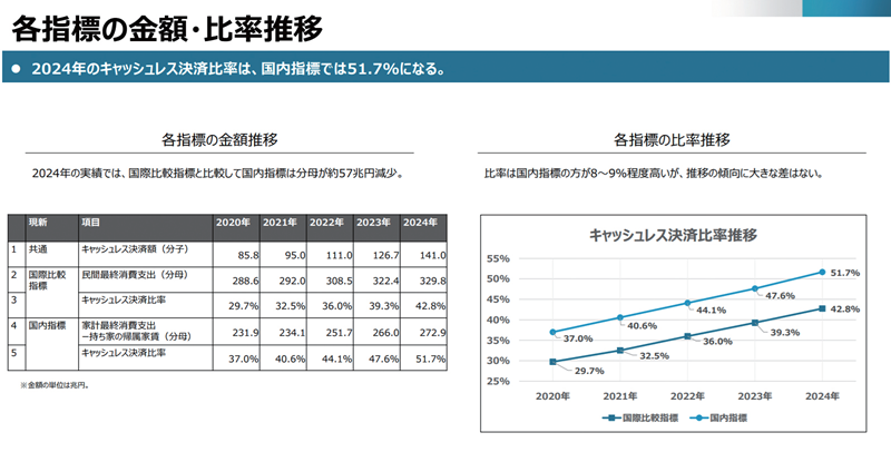 経済産業省の発表では、2024年のキャッシュレス決済比率は堅調に上昇し、42.8%(141.0兆円)となった。その分子の内訳は、クレジットカードが82.9%(116.9兆円)、デビットカードが3.1%(4.4兆円)、電子マネーが4.4%(6.2兆円)、コード決済が9.6%(13.5兆円)となった。