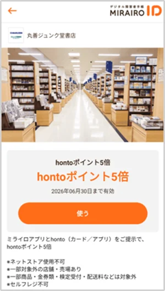 ミライロは、このほど、丸善ジュンク堂書店がミライロIDのライフプラットフォームに参画し、書店で使えるミライロクーポンの提供を2026年4月1日から開始した。なお、同取り組みは期間限定のトライアル導入として実施されるが、書店業界でミライロクーポンが導入されるのは初の試みだという。対象者は、ミライロアプリにてバーコードを表示し、honto(カード/アプリ)と一緒に提示するとhontoポイントが5倍となる。