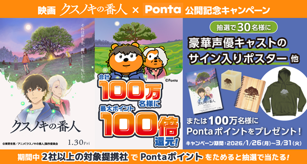 2026年1月26日7:20 共通ポイントサービス「Ponta(ポンタ)」を運営するロイヤ… 続きを読む »アニメ映画「クスノキの番人」でPonta提携社等46社以上のキャンペーン(LM)